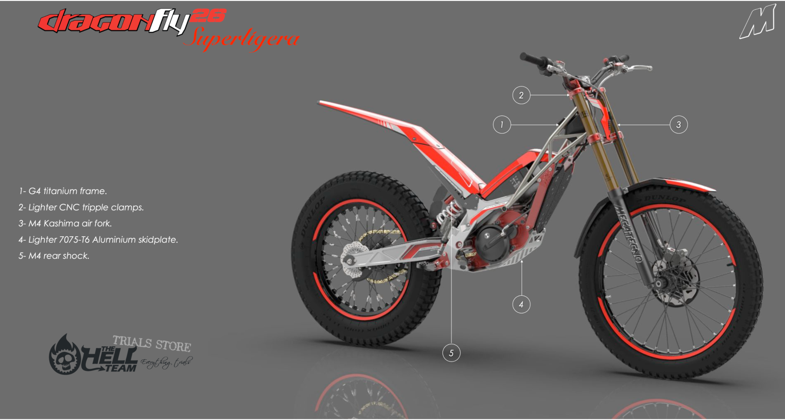 The Standard DragonFly has had a series of excellent improvements added, and there is also two new variants: The EXTENDER - a long range addition with extra battery capacity, and The SUPERLIGERA - a super trick light titanium frame SPECIAL, with M4 Kashima forks, M4 rear shock and other components to make this a crazy light special.